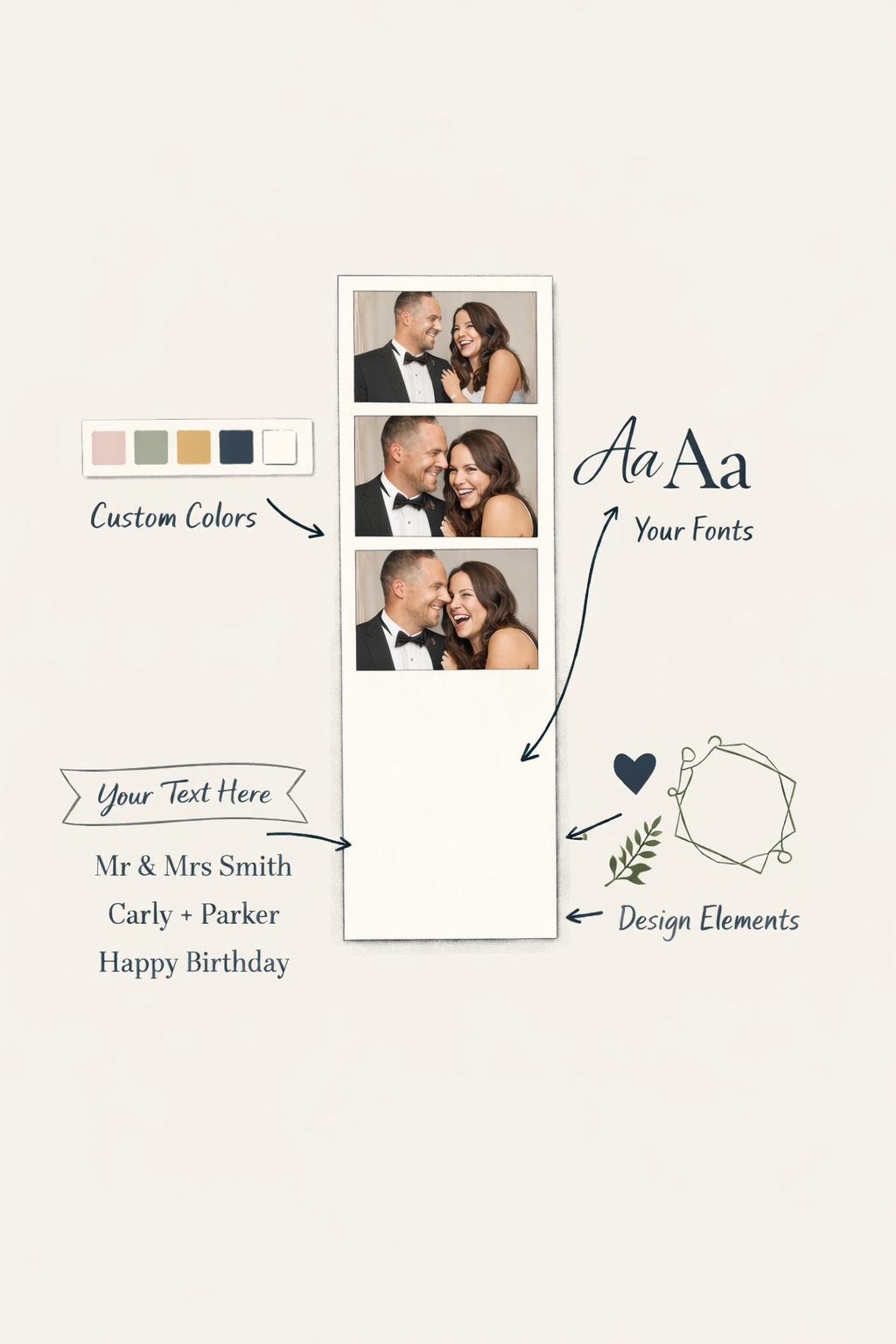 Your photo booth prints should feel like a natural extension of your celebration—not an afterthought. At Bokeh & Birch photobooth co, every print is custom designed to reflect your event’s aesthetic, from color palette and typography to layout and finishing details.