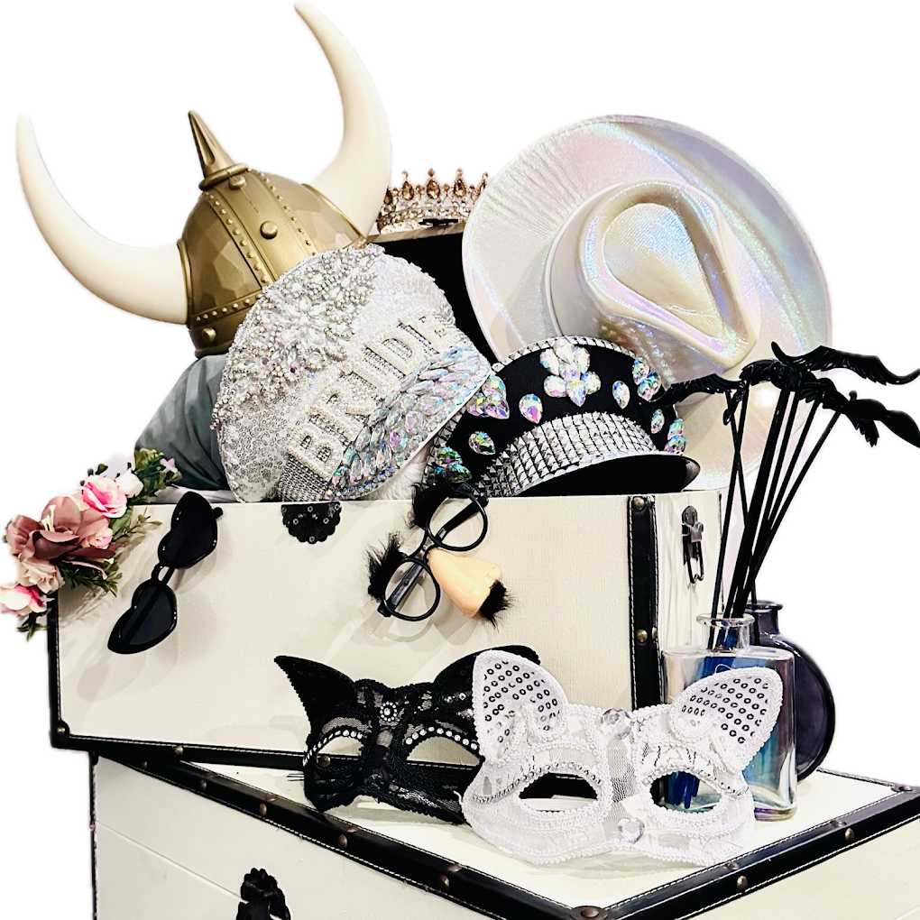 Our prop boxes are a treasure trove of creativity, designed to elevate your photo booth experience to new heights. Each box is thoughtfully curated with a delightful assortment of boho-chic accessories, playful hats, whimsical sunglasses, and elegant custom wood signs that cater to various themes and styles. Crafted with care to complement our beautifully handcrafted wooden photo booths, these props encourage guests to unleash their playful side while ensuring stunning, memorable captures that resonate with the event’s ambiance. Whether it’s a rustic wedding or a chic corporate gathering, our prop boxes add a layer of fun and personalization that perfectly aligns with your event. We also make customized prop signs.